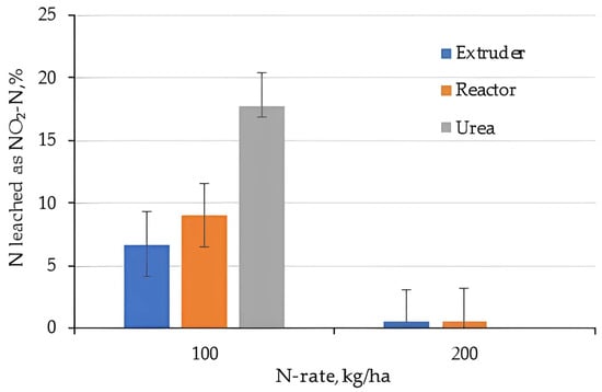 Nitrate as a proportion of total N leached was higher for the 100 kg/ha N treatment compared to the 200 kg/ha treatment, and was higher for Urea compared to hydrogel. This further supported the hypothesis that hydrogels act as nitrification inhibitors, in particular if applied at high rates. Granular urea is characterized by its high N concentration and rapid solubilization and, consequently, has low efficiency due to losses by leaching and volatilization []. To overcome this scenario, the use of hydrogel-coated urea was applied at a rate of 2% in sandy soil; the results indicate its efficiency in reducing N losses by limiting the nitrification rate and losses by nitrate leaching [].