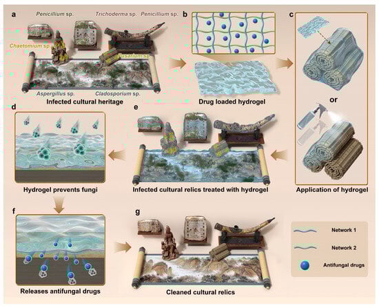 Conventional techniques for cultural heritage preservation face notable limitations in combating fungal biodeterioration, falling short of the increasingly rigorous standards required for modern conservation [,]. Physical preventive measures, such as improving ventilation and regulating temperature and humidity, can partially inhibit fungal growth but are insufficient to fully prevent its proliferation and spread [,,]. Chemical fungicides, while offering some degree of efficacy, carry the risk of secondary contamination and potential damage to the artifacts themselves [,,]. Moreover, prolonged use may promote the development of fungal resistance []. In recent years, hydrogels, novel polymeric materials characterized by their three-dimensional network structures and unique physicochemical properties, have gained significant attention across fields such as biomedicine, drug delivery, and agriculture [,,,,]. Their application in cultural heritage conservation and restoration has shown great promise, particularly in addressing fungal-related deterioration [,,,,,,]. Owing to their superior water absorption, moisture retention, biocompatibility, and customizable design, hydrogels can create a stable microenvironment that mitigates environmental stressors affecting cultural heritage []. More specifically, the antifungal efficacy of hydrogels in cultural heritage conservation primarily relies on their excellent controlled-release capability and interfacial adaptability. Their three-dimensional polymer network allows for the loading of antifungal agents and facilitates their sustained release via diffusion or in response to environmental stimuli such as pH or temperature, effectively inhibiting fungal growth. In addition, hydrogels can act as a physical barrier to prevent recontamination by microorganisms, thereby reducing the risk of secondary damage to the artifact. Owing to their superior moisture retention and moldability, hydrogels can closely conform to the surface of cultural objects, enhancing the localized effectiveness of the antifungal agents (Figure 1) []. However, current research on the systematic application of hydrogels in heritage conservation remains limited. This review aims to summarize recent progress in the use of hydrogel-based technologies for fungal control in cultural heritage, with the goal of advancing their practical implementation and fostering innovation in heritage science.