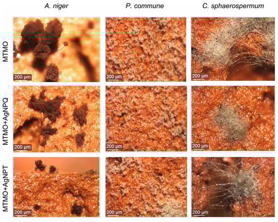 Stereomicroscopic images (80× magnification) showing the fungal resistance performance of sol-gel coatings containing MTMO after 30 days of incubation at 28 °C. Reproduced with permission []. Copyright © 2023, Nano-Structures & Nano-Objects.