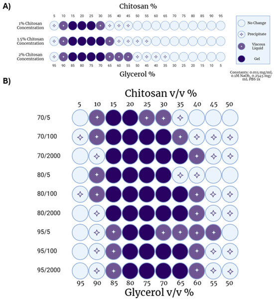 Chitosan–glycerol hydrogel parameterization. (A) Effect of chitosan solution concentration and chitosan:glycerol volume ratios on hydrogel gelation utilizing chitosan of average 70 DDA and 100 cP viscosity. (B) Effect of varied chitosan physiochemical factors on hydrogel gelation at various chitosan–glycerol relative volumes with constant 1.5% chitosan solution concentration. Created with BioRender.com (May 2023).