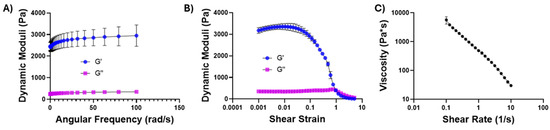 Rheological testing of chitosan–glycerol hydrogel. (A) Oscillatory frequency sweep performed at a strain of 1% (B); oscillatory amplitude sweep performed from shear strains of 0.1–500%; (C) viscosity sweep performed over shear rates of 0.1–10 Hz. Data are represented as the mean ± standard deviation for 3 replicates.