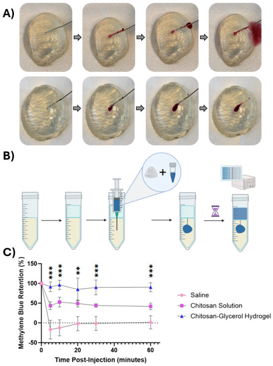 Injectability and retention of the chitosan–glycerol hydrogel in tumor phantoms. (A) Red dye formulated in saline solution (top row) rapidly exits the phantom along the needle track. In contrast, red dye formulated in chitosan–glycerol hydrogel (bottom row) is completely retained; (B) injection retention quantification protocol including the creation of an agar tumor phantom model and absorption reading of saline layer. Created with BioRender.com (May 2023) (C); retention values of a saline solution, 1.5% w/v chitosan solution, and chitosan–glycerol hydrogel loaded with 25 μg/mL methylene blue solution over 1 h. Data are represented as the mean ± standard deviation for 6 replicates. Mean comparison analysis between injection groups conducted from a one-way ANOVA (n = 3). ** p < 0.01, *** p < 0.001.