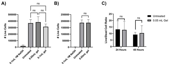 To evaluate the biocompatibility of chitosan–glycerol hydrogels, direct and indirect contact cell viability assays were performed in alignment with International Standard ISO 10993-1. For the indirect experiment, 3T3 murine fibroblasts seeded in the lower chamber of a transmembrane plate with chitosan–glycerol placed in the upper chamber. After 24 h, there were no significant differences in live cell counts between untreated and chitosan–glycerol-hydrogel-treated groups (Figure 5A). In the direct contact experiment, chitosan–glycerol hydrogel was mixed into the culture media before applying directly onto the fibroblasts. Once again, there were no significant differences in live cell counts when chitosan–glycerol hydrogel was added to the media (Figure 5B). To account for the possibility that the hydrogel increased cell death as well as proliferation, both live and dead cells were counted, and live/dead cell ratios were calculated over 48 h using the indirect setup. At both 24 and 48 h, there were no significant differences in live/dead cell ratios between untreated groups and cells exposed to chitosan–glycerol (Figure 5C). These data confirm that chitosan–glycerol does not impact cell viability.
