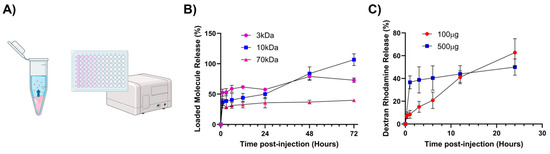 In vitro release assays were performed to understand the release kinetics of macromolecules (Figure 6A). Fluoresence-labeled dextrans of different MWs were used to model a range of immunotherapeutics. Three kDa and 10 kDa dextrans were selected to represent small molecule immunotherapeutics such as peptides and agonists [57]. Seventy kDa dextran represents larger molecule immunotherapeutics such as multimeric cytokines and bispecific molecules [58,59,60].