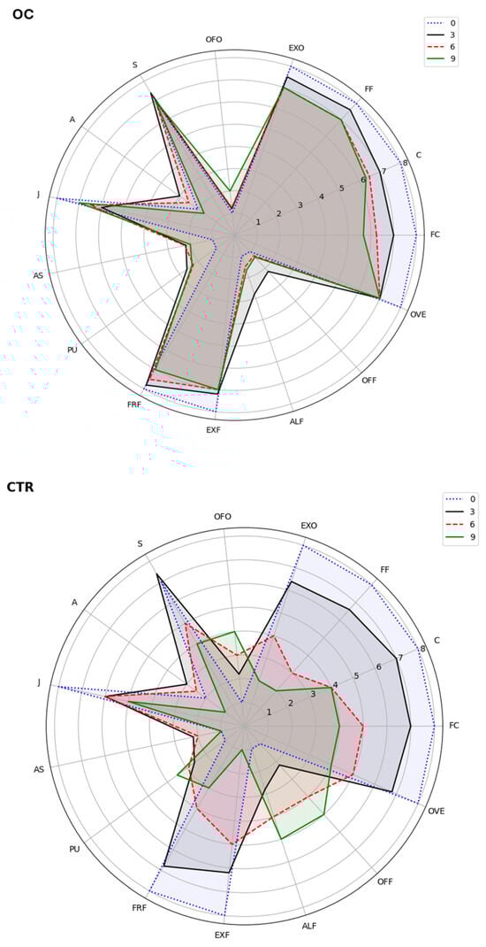 | OC | 10.54 ± 0.27 aA | 8.12 ± 0.73 aA | 7.63 ± 0.29 aA | 7.32 ± 0.17 aA | |