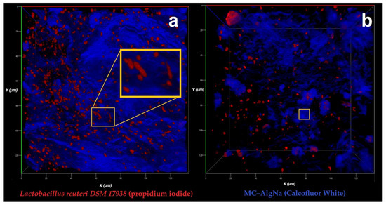 Confocal laser scanning microscopy (CLSM) images showing the distribution of Lactobacillus reuteri DSM 17938 entrapped within the polysaccharide matrix composed of mucilage–alginate (MC–AlgNa). (a) Cells stained in red with propidium iodide; the orange box highlights a magnified region to emphasize bacteria embedded within the matrix. (b) Polymer matrix stained in blue with Calcofluor White.