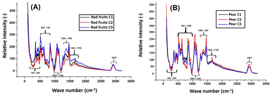 In the case of the pear-flavored beverage (Figure 4A), the peaks around 200–499 cm−1 are attributed to bond vibrations and heavy atom movements, such as those present in polymeric compounds or crystalline structures. These peaks are also associated with antioxidants and fruit-derived pectins. In contrast, in Figure 4B (red fruits), in this same region, fat-soluble fibers, antioxidants, and pectins present in the fruits (especially strawberries and blueberries) are highlighted, which contribute to the functional properties of the beverage and its structural stability. These results are consistent with those reported by Schulz and Baranska (2007) [40], who identified similar bands in fruits with high carbohydrate content, structural fibers, and pectins in fresh fruits.