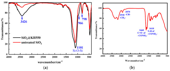 SiO2@KH550(FNS): The structure and spectrum of the nanomaterials were analyzed by infrared spectroscopy. As shown in Figure 1a, the infrared spectrum of SiO2 has a strong and broad peak at 3426 cm−1, which is the -OH stretching vibration peak. Compared with SiO2@KH550, the peak intensity is weakened, indicating that the hydrophilicity of nano-SiO2 is reduced and the -Si-OH structural units are decreased during the modification process. After modification, a peak appears at 966 cm−1 in SiO2, indicating that KH550 has successfully modified nano-SiO2. The peak at 1140 cm−1 is that of the Si-O-Si antisymmetric vibration. The peak at 960 cm−1 is that of the Si-OH bending vibration, and 798 cm−1 is the absorption peak of the Si-O-Si symmetric stretching vibration [13,15].