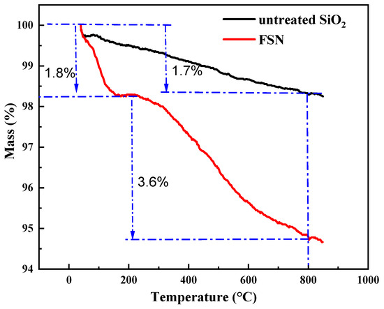 The thermal stability of unmodified nano-SiO2 and FSN were evaluated using a Dupont 2100 thermogravimetric analyzer. The experimental temperature range was 40 °C to 800 °C, with a heating rate of 10 °C·min−1.