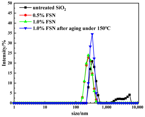 Figure 3 shows the particle size distribution of untreated SiO2 and FSN before and after heating at 150 °C. The particle size distribution of unmodified nano-SiO2 exhibited a bimodal distribution, with particles existing at both nanometer and micrometer scales. This indicates poor dispersibility of the unmodified nano-SiO2, as the particles tend to aggregate. In contrast, the modified nano-SiO2 showed a narrow particle size distribution centered around 300 nm, with minimal changes in particle size observed as the concentration increased. This suggests that the modification significantly enhanced the dispersion stability of the nanoparticles.