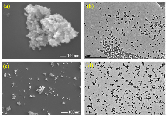 (a) SEM images of untreated nano-SiO2; (b) TEM images of untreated nano-SiO2; (c) SEM images of SiO2@KH550; (d) SEM images of SiO2@KH550.