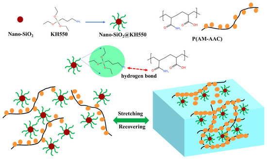 P(AM-AAC) was polymerized with the prepared SiO2@KH550 as a dynamic cross-linking agent to obtain the physically cross-linked nanocomposite hydrogel P(AM-AAC)/SiO2@KH550, as shown in Figure 5. The typical preparation process is: Dissolve 0.05 g of SiO2@KH550 mixed nanoparticles in 50 mL of deionized water and ultrasonically disperse to obtain a uniform solution. Then, 15 g of AM and AAC were added to the above solution. Finally, in a nitrogen atmosphere, the initiator APS was added, and the polymerization reaction was carried out at 70 °C for 6 h. The hydrogel obtained was denoted as GCS (P(AM-AAC)/SiO2@KH550.