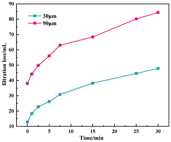 According to Figure 6, for the 30 μm sand pan, the instantaneous filtration loss is 12.8 mL, and the filtration loss reaches 47.8 mL within 30 min, showing an unsatisfactory plugging performance. For 90 μm sand pan, the instantaneous filtration loss reached 38 mL. After the formation of instantaneous mud cake, the filtration loss gradually decreased, and the filtration loss increased to 84.4 mL within 30 min. The results showed that it was difficult for base mud to effectively plug the 90 μm large pores, and the large instantaneous filtration loss was easy to cause the instantaneous intrusion of filtrate, resulting in wellbore instability.
