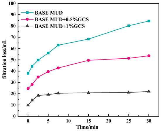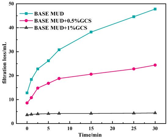 According to Figure 7, for 30 μm sand sheet, the sealing effect of adding GCS is significantly better than that of the base slurry. Adding 0.5% GCS can reduce the 30 min filtration loss to 24.4 mL, and the instantaneous filtration loss is only 8.6 mL. When the GCS dosage reached 1%, the instantaneous filtration loss was reduced to 3.6 mL, and the filtration loss within 30 min was only 4.4 mL. Moreover, it can be found that with the increase in time, the curve gradually tends to be smooth, indicating that the dense sealing layer is formed on the surface of the sand disk, which effectively improves the permeability sealing performance.