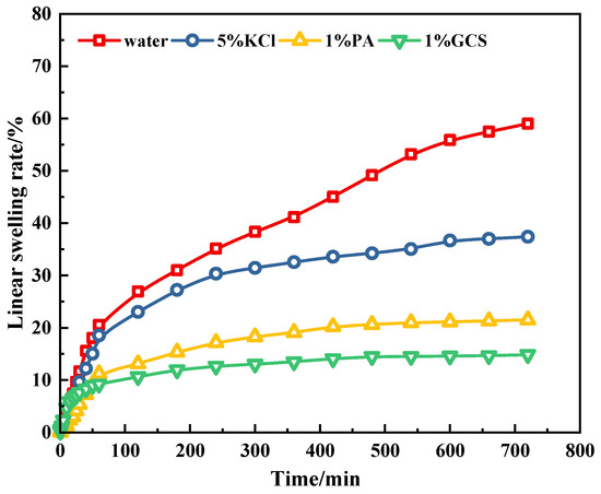 Figure 9 shows the linear swelling rates of the prepared bentonite cakes in water, 5% KCl solution, 1% polyamine solution, and 1% GCS dispersion. After the bentonite cake samples were immersed in water, the linear swelling rate increased rapidly. After 16 h, the swelling rate of the bentonite samples in water reached 55.8%. This is because water molecules can enter the clay layers without hindrance of inhibitors, causing significant hydration and swelling of the clay layers. In contrast, the linear swelling rates of the bentonite samples in 5% KCl solution and 1% polyamine solution were 37.4% and 21.5%, respectively. The linear swelling rate of bentonite in 1% GCS decreased significantly to 14.8%, indicating that GCS is more effective than KCl and polyamine in inhibiting the hydration and swelling of clay minerals, which is beneficial for maintaining wellbore stability.