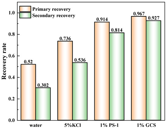 The recovery rates of the cuttings after hot rolling in 1 wt% GCS, 1 wt% polyamine, and 5 wt% KCl solutions were further evaluated, as shown in Figure 10. The results indicated that the recovery rate of the shale cuttings in pure water was only 52%. This was because the clay minerals were prone to hydration and dispersion in pure water, leading to a reduced recovery rate. However, in a 5 wt% KCl solution, the recovery rate reached 73.6%, suggesting that small cations have a certain inhibitory effect on clay hydration. Under the inhibition of 1 wt% polyamine, the recovery rate of the cuttings reached 91.4%. Surprisingly, 1% GCS could increase the recovery rate of the cuttings to 96.7%, indicating that GCS has excellent performance in inhibiting clay hydration and dispersion [25,26]. It is crucial for maintaining wellbore stability. Further, the recovery rates of the cuttings after secondary hot rolling in different solutions were determined to evaluate the durability of the chemical agents. The results showed that after secondary hot rolling, the secondary recovery rate of the cuttings treated with GCS only slightly decreased, indicating a strong interaction between GCS and the shale cuttings. Even when the shale was washed and re-exposed to water, the inhibitory effect of GCS still existed, demonstrating long-term inhibition. Compared with KCl and PA, the GCS inhibitor was more effective in inhibiting the hydration and dispersion of shale. For the cationic amine inhibitor (PA), it showed comparable inhibitory performance to GCS at 77 °C, but in the secondary recovery experiment at 150 °C, the inhibitory effect significantly weakened, and the secondary recovery rate of the cuttings was less than 90%. This was due to the hydrolysis of the ether bond in PA at high temperatures. The 96.7% cuttings recovery (exceeding API 90% threshold) validates GCS’s dual action in maintaining shale structural integrity, a critical metric for borehole stability.
