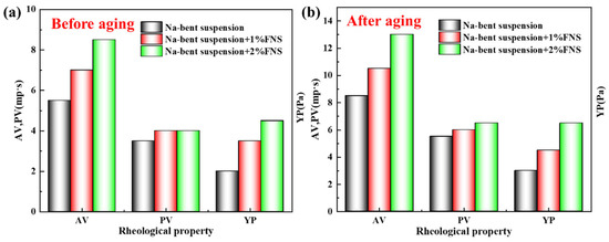 The influence of FNS on the rheological properties of Na-Bent base mud; (a) before aging; (b) after aging at 150 °C.