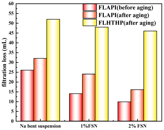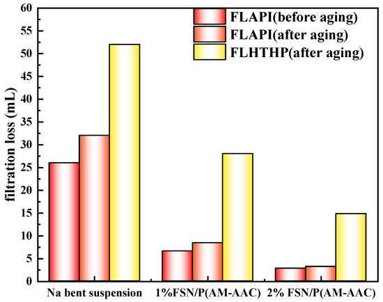 Micro-nano plugging agents can reduce the filtration volume of drilling fluid to a certain extent. We further evaluate the effect of FNS and FNS/P(AM-AAC) on the filtration performance of drilling fluid, as shown Figure 13 and Figure 14. Before aging, when 1% FNS was added, the filtrate loss of drilling fluid decreased from 26 mL without FNS to 14 mL; when the addition amount increased to 2%, the filtrate loss decreased to 9.8 mL. After aging at 150 °C, the filtrate loss of drilling fluid increased. The filtrate loss of drilling fluid without FNS increased to 32 mL, while when 1% FNS was added, the filtrate loss decreased to 24 mL; when the addition amount increased to 2%, the filtrate loss of drilling fluid decreased to 16 mL. The results show that when drilling fluid is affected by high temperature, it will also cause the filter cake to thicken and the permeability to decrease, resulting in an increase in fluid loss. However, FNS can significantly reduce the filtrate loss of drilling fluid to a certain extent. This is mainly because FNS is a nano-scale particle that can effectively fill and embed in the filter cake, block pores, and reduce fluid loss. However, a single FSN particle is insufficient for filtration loss control. The high-temperature and high-pressure filtration loss was further evaluated, and the results are shown in the figure. After being aged at 150 °C for 16 h, the high-temperature and high-pressure filtration loss of 4% bentonite suspension was 52 mL. When 1% FSN was added, the high-temperature and high-pressure filtration loss was reduced to 48 mL. The 2% FSN reduced the high-temperature and high-pressure filtration loss to 46 mL, which is still a relatively large filtration loss and is difficult to meet the drilling requirements in engineering. The results of API and high-temperature and high-pressure fluid loss both indicate that a single nanomaterial can reduce the fluid loss of drilling fluid to a certain extent, but this reduction is difficult to meet the requirements.