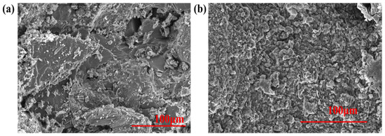 The cuttings from the shale rolling recovery experiment were collected, and the changes in the microstructure of the cuttings’ surface before and after the GCS treatment were observed by SEM. Figure 15a shows the SEM image of the original shale cuttings, revealing that the surface of the original shale cuttings is rough and has a large number of pores, which provide channels for water to invade the rock, making the rock prone to hydration when exposed to water. Figure 15b shows the microstructure of the cuttings after treatment with 1% GCS dispersion. In contrast, after treatment with 1% GCS, the surface of the cuttings becomes more compact and smooth, and the tiny pores and fissures on the surface are filled with nanoparticles [12,16,18]. The microstructure of the rock surface proves that GSC changes the micromorphology of the rock sample surface through physical adsorption and filling, thereby ensuring that the rock sample is less prone to hydration instability. The gel system can deposit a layer of polymer film-like substances on the rock surface, thereby effectively reducing the intrusion of filtrate into the formation. Nanoparticle penetration into micro fractures visualizes the “physical shield” mechanism, fulfilling the core aim of micro-scale barrier formation against hydration.