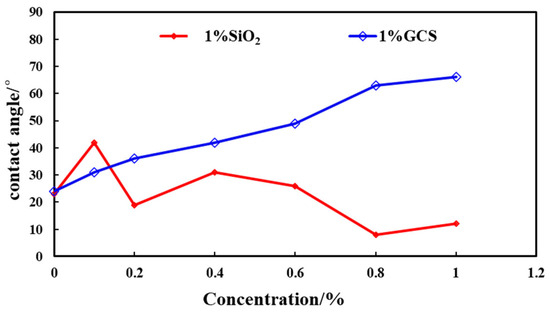 The influence of GCS concentration on the contact angle was investigated and compared with that of unmodified nano-SiO2. As shown in Figure 16, with the increase in concentration, the contact angle of the solid surface treated with unmodified nano-SiO2 gradually decreased, and the sample was highly hydrophilic. This was mainly due to the large specific surface area of the nanoparticles, which increased the contact area between the solid and the liquid after adsorption on the solid surface. The hydrophilic hydroxyl groups on the solid surface increased, and the attraction with water molecules was enhanced, thereby increasing the hydrophilicity. With the increase in GCS concentration, the contact angle of the core sample surface rapidly increased. When the GCS concentration reached 1%, the contact angle exceeded 60°. As the concentration continued to increase, the contact angle of the system gradually stabilized [17,19]. The results indicated that GCS could significantly increase the contact angle and change the wettability from hydrophilic to hydrophobic. The error bars indicated that the experimental error was small and the results were statistically significant. Hydrophobic transformation of shale surfaces proves GCS’s chemical inhibition efficacy, a strategic solution to weaken fluid-shale interactions.