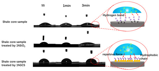 The dynamic changes in the contact angles of the original shale surface, 1% SiO2 treated shale surface and 1% GCS treated shale surface are shown in Figure 17. The water contact angle of the original shale is only 23°, indicating a strong hydrophilic property. After the water droplet is placed on the shale surface, it spreads directly to the surroundings, as shown in Figure 16. This is mainly due to the presence of a large number of hydrophilic hydroxyl groups on the shale surface, which form hydrogen bonds with water molecules and cause the water molecules to spread on the rock surface. The contact angle of the shale surface treated with 1% SiO2 further decreases, and the spreading speed is faster. After being soaked in 1% GCS dispersion, the shale surface becomes hydrophobic, with a contact angle of over 60°, and the contact angle remains basically unchanged for a period of time, showing strong stability. This is mainly because FSN nanoparticles are adsorbed on the shale surface, forming a micro–nano rough structure. In addition, the hydrophobic chains on the surface of the nanoparticles face outward, forming a hydrophobic repulsive force with water molecules, hindering the adsorption and spreading of water molecules. The existence of the micro–nano rough structure and hydrophobic chains meets the conditions for constructing a hydrophobic interface, thereby transforming the wettability of the shale surface into a closed hydrophobic surface.