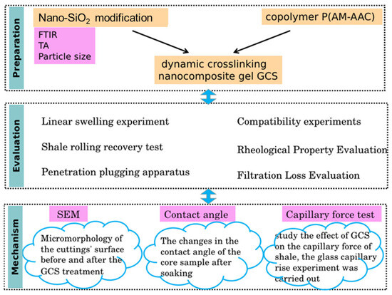 Figure 20 shows a flow chart demonstrating the methodology of our work. Firstly, modified nano-silica and dynamic cross-linked gel were prepared, and the molecular structure of the synthesized product were characterized by experimental means. Next, the sealing performance, the performance of inhibiting the hydration of mud shale, as well as the rheological and fluid loss performance of the drilling fluid were evaluated. Finally, the application mechanism of this dynamic cross-linked gel material in drilling fluid was studied by various means.