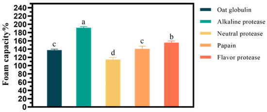 The effect of different enzymes on the foam capacity of oat globulin hydrolysates. Dark green: Oat globulin. Lowercase letters in the column express the statistical significance among different groups at p < 0.05.