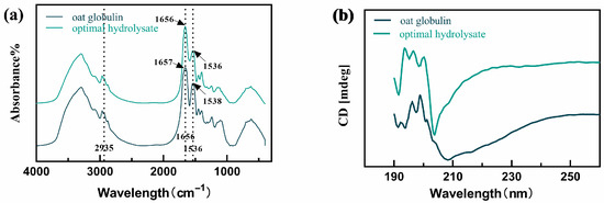 Samples of oat globulin and its hydrolysate were lyophilized for three days before being stored in a refrigerator at 4 °C. The powdered sample was then mixed with potassium bromide (KBr) and pressed into a disk. Fourier transform infrared (FTIR) spectra were recorded with a resolution of 4 cm−1 over the range of 4000 to 400 cm−1 using a Fourier transform infrared spectrometer (Thermo Nicolet iS5, Waltham, MA, USA) [58]. Data analysis was performed using OMINC software (version 8.2).