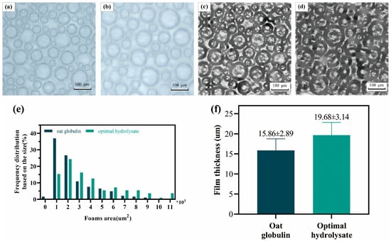 Figure 4a–d show the foam formed by oat globulin and its hydrolysate, while Figure 4e,f show the bubble size distribution and the thickness of the liquid film, where the liquid film is regarded as the dark layer surrounding each bubble. Relevant measurements were obtained using ImageJ/FIJI 1.54f; Figure 4e,f show the bubble size distribution and the thickness of the liquid film, or the film regarded as the dark layer surrounding each bubble. Figure 4a–d show the foams formed by oat globulin and its hydrolysates. Total optimal hydrolysate foams had more bubbles with larger sizes (gas cells) compared to oat globulin.