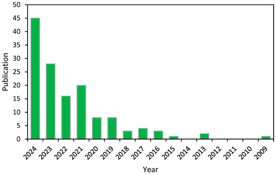 Since 2016, the number of publications has steadily increased, particularly in 2019 and 2020, with eight articles published each year. From 2021 onward, this trend intensified, reaching a peak in 2024 with 45 published articles (Figure 3). This growth demonstrates that the topic has transitioned from a niche area to a recognized field of study. Continued growth is anticipated as global policies increasingly prioritize the valorization of waste materials within sustainable development initiatives.