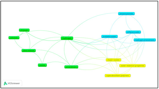 Additionally, Figure 5 illustrates the correlation with hydrogels, analyzing the most frequently used keywords in published articles and highlighting some possible research objectives, particularly in publications focused on Agricultural Sciences, Food Sciences, and Technology. This analysis reaffirms that the primary focus is on studying hydrogels based on natural plant residues. The word “hydrogel” is linked to three blocks denoted in different colors, representing the keywords used together for the publication of scientific articles. Figure 5 shows that the words “available water” are the second most relevant, indicating that the issue of water availability is directly related to the study of hydrogels based on agro-industrial waste.