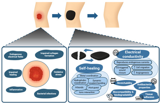 Self-healing electroconductive hydrogels have grown from laboratory research interests to multifunctional wound dressings able to handle the daily movements of patients while furnishing wounds with the electrical, biochemical, and antimicrobial cues that accelerate tissue repair. Recent literature has shown how the combination of polymeric networks with conductive elements can, indeed, mimic skin tissue and actively promote healing at cell and tissue levels. These materials have shown better performance than current gold-standard wound dressings in treating wounds, such as Tegaderm™, since they have been shown to promote improved wound closure with blood vessels and have epidermal thickness and skin appendages closer to human skin, with decreased inflammation, as well [38,65,95].