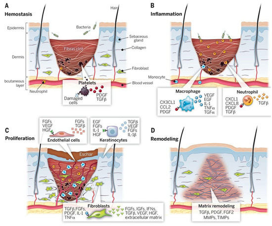 Four stages in wound healing: (A) hemostasis, (B) inflammation, (C) proliferation, and (D) remodeling. Reprinted with permission from ref. [9]. Copyright 2018 Elsevier.