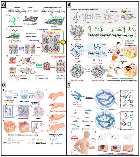 Having explored the mechanisms behind self-healing and conductivity separately, this section now examines how both features can be integrated into a single platform for wound healing.