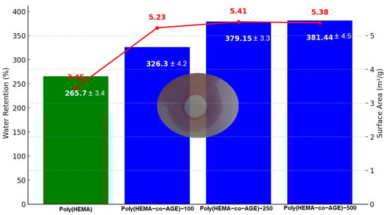 2/g), while Poly(HEMA-co-AGE)-500 exhibited the most significant water retention capacity (381.44%). The simultaneous enhancement in both parameters suggests that AGE incorporation increases porosity and hydrophilic interactions, promoting improved swelling behavior and increased accessible surface areas. Interestingly, although the surface area plateaued between AGE-250 and AGE-500, water retention continued to rise slightly, implying that additional AGE may contribute more to water-binding efficiency than further surface area increases [