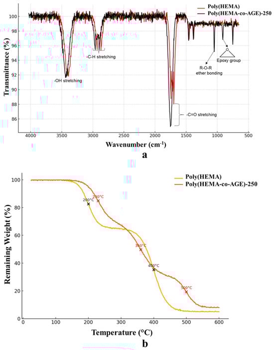 −1, indicative of R–O–R ether linkages, further supports the presence of glycidyl units. These spectral features, either absent or significantly weaker in the neat Poly(HEMA), are clear evidence of successful copolymerization and the introduction of reactive moieties for further crosslinking or functionalization [