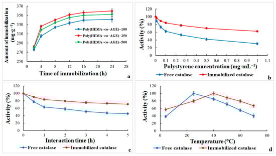 34]. Furthermore, the immobilization capacity levels off after 12 h, indicating the saturation of available binding sites or the attainment of equilibrium in the enzyme-loading process. Poly(HEMA-co-AGE)-250 generally appears to be the most suitable matrix for catalase immobilization, with 16 h being optimal.