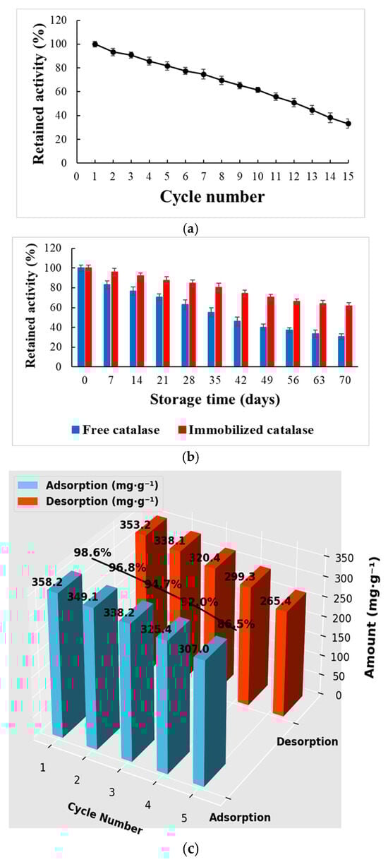 Figure 4d presents the temperature-dependent activity profiles of free and immobilized catalase in the presence of PS-MPs. Free catalase activity increases rapidly and peaks as the temperature rises from 4 °C to 25 °C. In contrast, immobilized catalase gradually increases, achieving maximum activity (100%) at 40 °C. This pattern indicates that immobilization improves thermal resistance, allowing catalase to function efficiently at elevated temperatures.