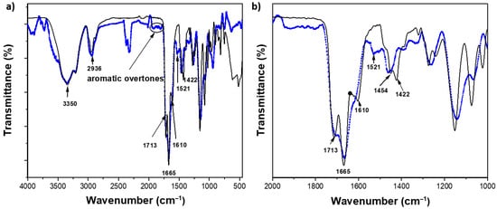 (a) FTIR spectrum of the copolymer and P(HEMA-co-AAm) with 0.5 mol.-% BSP/MBA (blue line), 0.5 mol.-% MBA (black line), range 4000–500 cm−1. (b) Wavenumber range 2000–1000 cm−1.