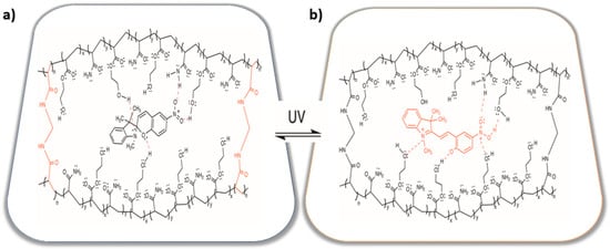 Schematic representation of the photoactive P(HEMA-co-AAm)-BSP hydrogels, with MBA. (a) Before irradiation, (b) after irradiation, which is photoisomerized to the zwitterionic merocyanine (MC) form by UV light irradiation.