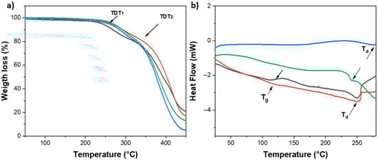 The TGA analysis of hydrogels at a 1:1 feed ratio of monomer with 0.1 and 0.5 mol.% MBA and 0.1 and 0.5 mol.% MBA/BSP exhibited similar thermal decomposition, in general presented in two-step degradations, see Figure 3a. The hydrogel at 0.5 mol.-% MBA exhibited the highest thermal stability with a residual loss mass percentage of 18% for the hydrogel, with extrapolated thermal decomposition temperatures, such as TDT1 at 261.6 °C and TDT2 at 349.5 °C. The hydrogels presented similar thermal behavior but exhibited greater thermal stability for the 0.5 mol.-% MBA in the study.