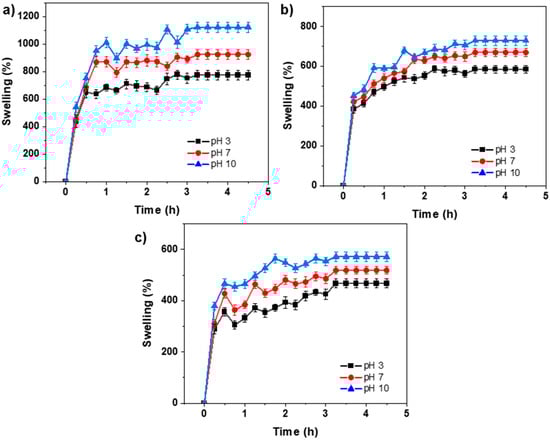 Hydration tests of the copolymer P(HEMA-co-AAm) 1:1 feed ratio of monomer at pH 3 (black line), pH 7 (red line), and pH 10 (blue line); (a) at 0.1 mol.-% MBA/BSP, (b) at 0.3 mol.-% MBA/BSP, (c) at 0.5 mol.-% MBA/BSP. The experiments were performed in triplicate, and the standard deviation was determined (σ < 5%).