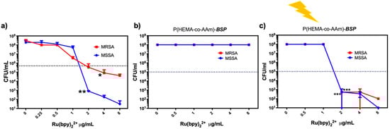 The photodynamic antimicrobial activity of the P(HEMA-co-AAm)-BSP copolymer in combination with the Ru(bpy)22+ photosensitizer. The photodynamic antimicrobial activity against methicillin-susceptible (MSSA) and methicillin-resistant (MRSA) Staphylococcus aureus was assessed: the MIC of the photosensitizer Ru(bpy) was determined between 0 and 8 µg/mL (a), the intrinsic antibacterial activity of P(HEMA-co-AAm)-BSP was evaluated in the dark (b), and the reduction in MIC for P(HEMA-co-AAm)-BSP and PS activated by light was assessed by embedding 0–8 µg/mL Ru(bpy) in the P(HEMA-co-AAm)-BSP matrix (c). Bacterial viability is expressed as the log10 of the mean ± SD, with * p < 0.05, ** p < 0.01, and *** p < 0.001 from a two-tailed t-test with comparison to control bacteria in the dark.