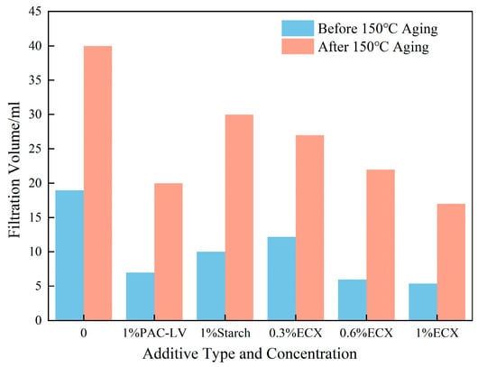 The filtration performance of ECX in water-based drilling fluids was evaluated according to the American Petroleum Institute (API) recommended standard test method. Specifically, the prepared ECX samples were dissolved in the base drilling mud at appropriate concentrations. The resulting solution was then placed into a medium-pressure filter press (Model SD-4, Qingdao Haitongda Special Instrument Co., Ltd., Qingdao, China), and the filtrate volume was recorded over a 15 min period.