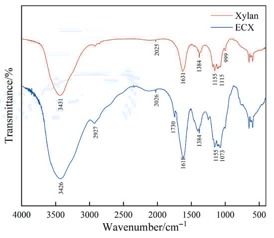 Figure 2 compares the FT-IR spectra of native xylan and the ECX. To ensure the accuracy and comparability of our FTIR analysis, all spectra were baseline-corrected and normalized under identical instrumental settings and sample preparation protocols. Notable spectral changes were observed after dual chemical modification. The increased intensity of the C–H stretching vibration band near 2920 cm−1 suggests the successful incorporation of aliphatic side chains, such as carboxymethyl and propylene oxide groups, during the functionalization process. A distinct new absorption peak emerged at approximately 1730 cm−1, corresponding to the C=O stretching vibration of carboxylic acids or ester groups, indicating the successful introduction of carboxymethyl functionalities.