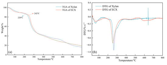 In the TGA profiles (Figure 3), ECX exhibited a noticeable enhancement in thermal stability compared to the unmodified xylan. The onset decomposition temperature (Td) increased from approximately 220 °C to 242 °C after modification. Furthermore, the mass loss rate within the 200–400 °C range was significantly reduced, indicating a more gradual and controlled degradation process. This improvement is attributed to the formation of covalent crosslinks via epichlorohydrin, which restrict molecular chain mobility and enhance thermal resistance by constructing a three-dimensional network that limits chain scission and volatilization.