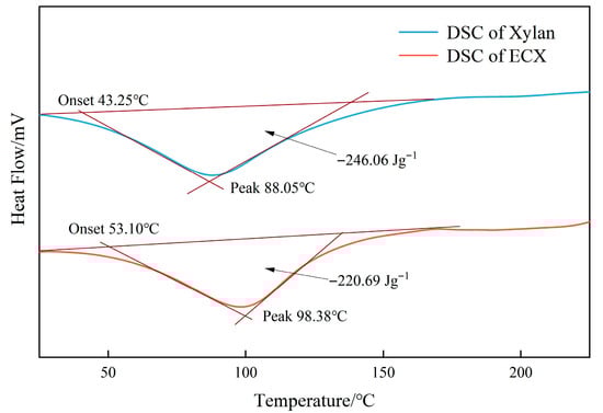 Differential scanning calorimetry (DSC) measurements of ECX and unmodified xylan were performed using a DSC instrument (DSC 3+, Mettler Toledo, Shanghai, China) under nitrogen flow (50 mL/min). The samples were heated from 25 to 250 °C at a rate of 10 °C/min and sealed in aluminum crucibles.