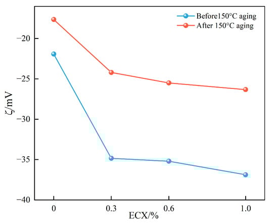Zeta potential is a key parameter reflecting the surface charge density of colloidal particles and the electrostatic stability of dispersions. As shown in Figure 6, the unmodified base slurry exhibits a ζ-potential of approximately −25 mV, indicating limited electrostatic repulsion and a potential risk of particle aggregation. Upon incorporation of ECX, the ζ-potential significantly increases to −52 mV, suggesting an enhanced electrostatic repulsion between particles and a marked improvement in colloidal stability.