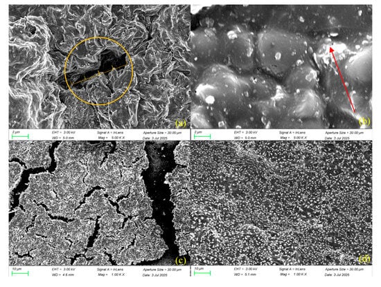 In contrast, the filter cake with 1.0% ECX (Figure 7b) exhibited a significantly more compact and uniform morphology. A continuous polymer film was observed coating the particle surfaces, reducing pore volume and enhancing interfacial integrity. This suggested that ECX effectively reorganized the particle network, forming a denser polymer–clay composite structure with enhanced sealing properties.