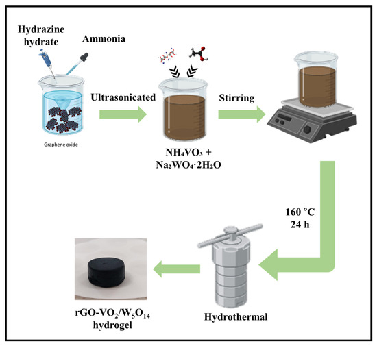 Schematic illustration of synthesis of rGO-VO2/W5O14 hydrogel.